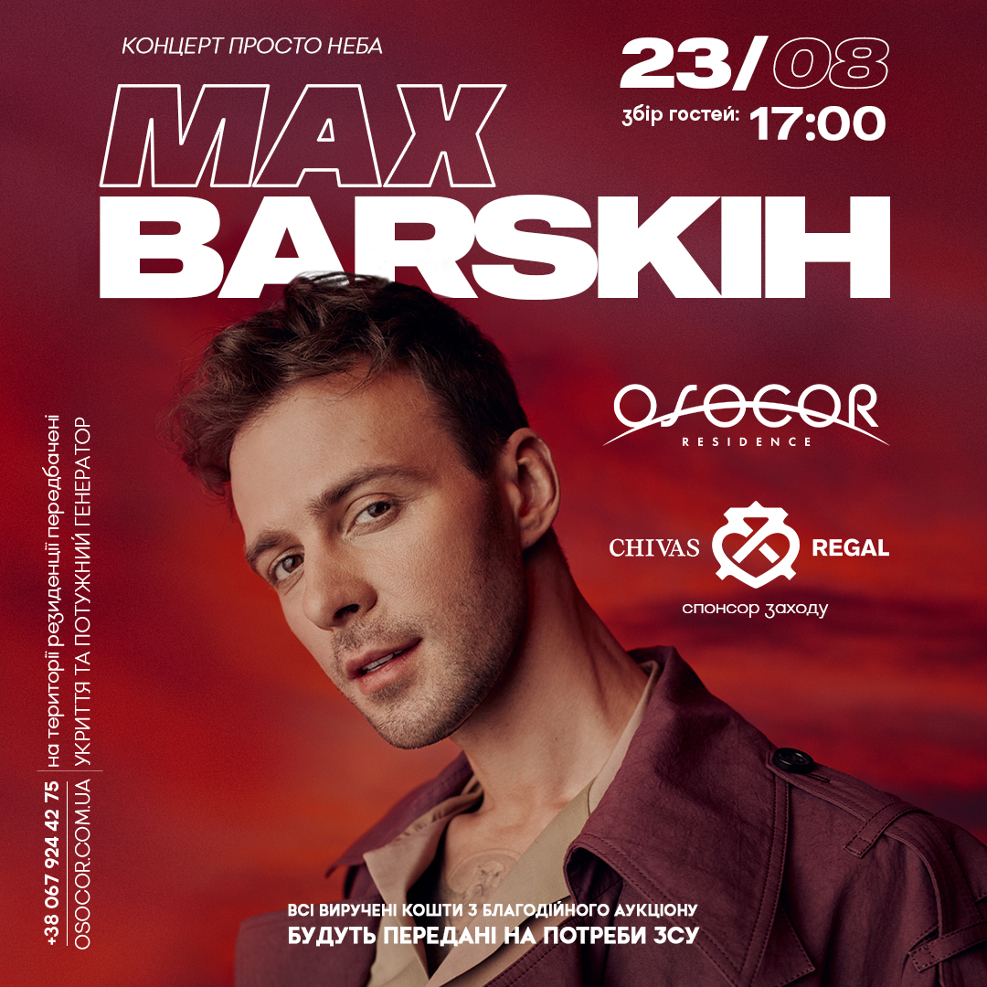 Після гучного концерту Макса Барських в столичному Палаці спорту для 10 тис шанувальників з шоу “Зорепад. На біс”, музикант виступить просто неба в Osocor Residence. Open Air артиста запланований на 23 серпня. У рамках концерту діятиме благодійна ініціатива співака meet & greet, завдяки якій кожен охочий зможе, придбавши спеціальний квиток-донат у розмірі 5 тис грн, не тільки зустрітися з артистом, зробити фото та взяти автограф, а й допомогти українським захисникам. 100 відсотків прибутку від ініціативи буде спрямовано на цільові потреби ЗСУ.