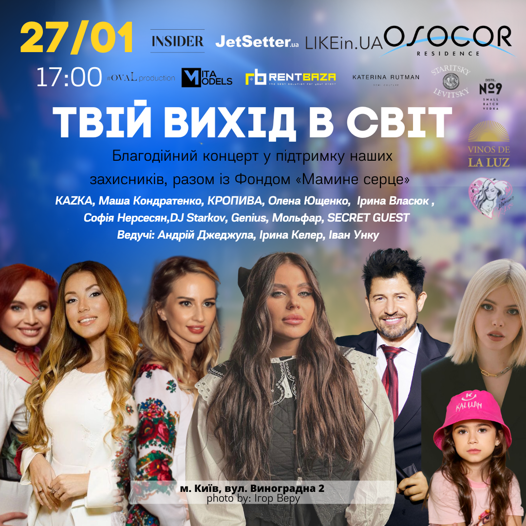 На вас чекає благодійний концерт від українських зірок KAZKA , Маша Кондратенко ,КРОПИВА ,Софія Нерсесян ,Genius ,DJ Starkov та SECRET GUEST, частування від закладу, фото та відеорепортаж й звісно великий благодійний аукціон.